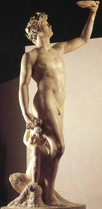 The god appeared on many kraters and other wine vessels from classical Greece. His iconography became more complex in the Hellenistic period, between severe archaizing or Neo Attic types such as the Dionysus Sardanapalus and types showing him as an indolent and androgynous young man and often shown nude.