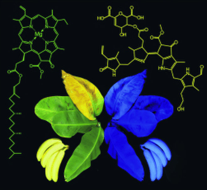 Why does the breakdown of chlorophyll occur differently in bananas than in other higher plants, including even banana leaves? In contrast to humans, many of the animals that eat bananas can see light in the UV range. The blue luminescence of the banana fruit could give them a distinct signal that the fruit is ripe. Or perhaps the chlorophyll degradation products also serve a biological function for the banana. The amazingly stable catabolytes could help to prolong the viability of the ripening fruit.