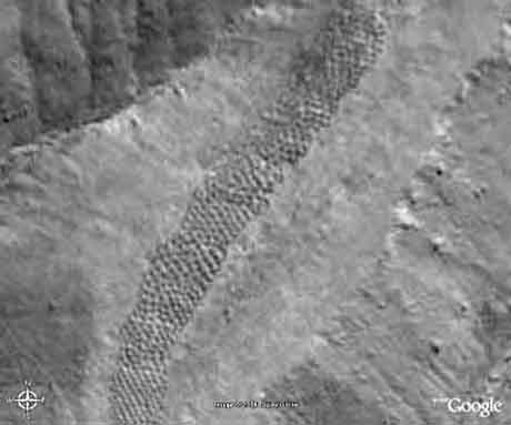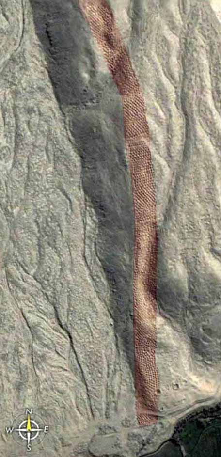 The band begins at the edge of a valley and runs up a hill for about 1.5 km (0.9 miles). The holes, actually pits with raised edges, are about 1 meter in diameter and 50-100 cm deep. They are arranged in discernible blocks or segments along a band that varies in width from 14-21 meters, with an average width of about 19 meters.