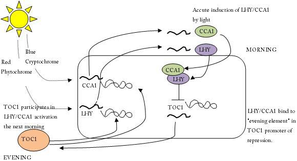 The central oscillator generates a self-sustaining rhythm and is made of two genes: CCA1 (Circadian and Clock Associated 1) and LHY (Late Elongated Hypocotyl) that encode closely related MYB transcription factors that regulate circadian rhythms in Arabidopsis. When CCA1 and LHY are over-expressed (under constant light or dark conditions) plants become arrhythimcal and mRNA signals reduce contributing to a negative feedback loop. CCA1 and LHY expression oscillates and peaks in early morning while TOC1 oscillates and peaks in early evening. From past observations and studies, it is hypothesized that these three components model a negative feedback loop in which over-expressed CCA1 and LHY repress TOC1 and over-expressed TOC1 is a positive regulator CCA1 and LHY.