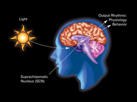 Circadian rhythms are important in determining human sleep patterns. The body's master clock, or SCN, controls the production of melatonin, a hormone that makes you sleepy. Since it is located just above the optic nerves, which relay information from the eyes to the brain, the SCN receives information about incoming light. When there is less light - like at night - the SCN tells the brain to make more melatonin so you get drowsy.