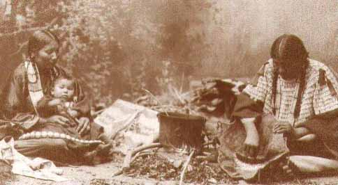 The Buffalo Dance - One of the primary sources of food and other needs was the American Bison. The typical hunting method was drive a herd off a cliff and butcher them after they died at the bottom of the cliff. Similar methods were used in ancient Europe.The night before, the shaman ceremonially smokes tobacco and prays to the sun. His wives are not allowed to leave their home, nor even look outside, until he returns; they were to pray to the sun and continually burn sweet grass. Fasting and dressed in a bison headdress, the shaman led a group of people at the head of a V formation. He attracted the herd's attention and brought them near the cliff; they were then scared by other men hiding behind them, who waved their robes and shouted. The bison ran off the cliff and died at the rocks below.
