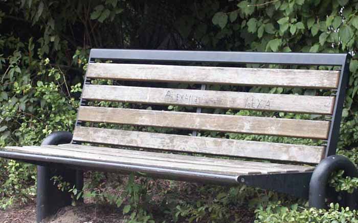The name "Alexander", as in Sarah and Alexander, is clearly etched into the bench, with the letters AEXA to the right of it.