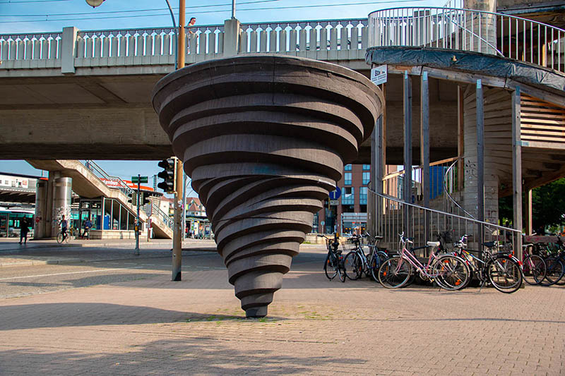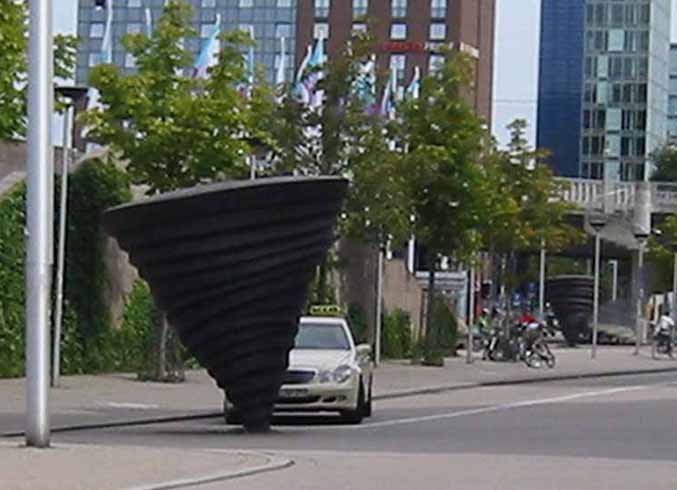 I drove Nicole and Andy to the Freiburg train station as they headed off for further adventures in Brussels. Just after we dropped them off, Pat and I drove past four cast iron spiral sculptures, or cones, on the city square not far from the university. Before the trip, Pat kept seeing spirals pointing downward and was elated when we found these. I could not stop the car long enough for Pat to capture all four spirals, but she photographed two.
