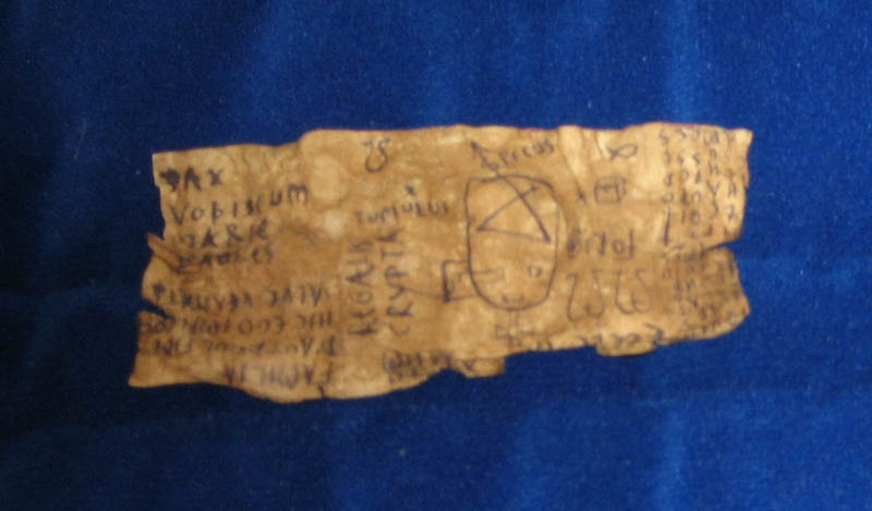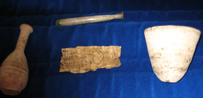 Along the top we see an ancient perfume vial made of alabastron. The unrolled scroll was inside the vial.