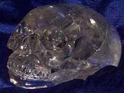 The jaw of the Blue Star Maiden is movable. She was carved from one piece of crystal that weighs thirty-one pounds and is of the singing variety, meaning it sings or chimes when struck, like the Diamantina Crystals from Minas-Gerais, Brazil. Moon Hawk, who carved the crystal skull, says the spirit who asked for the carving said it is not a human shaped skull but like those of the Pleiadians which is why it is longer and wider, and carries their energies. When people sit and chant with the skull, they allegedly see the face of Blue Star Maiden.