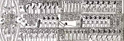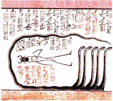 On the second shrine of the pharaoh Tutankhamen, a unique and enigmatic two-part book was discovered in his tomb by the English archaeologist, Howard Carter. It is speculated that the book covers the creation and rebirth of the sun; however, the true meaning of the book is not known due to the use of cryptographic illustrations to preserve the secrecy of the formulas.