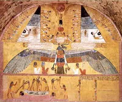 These goddesses of the night were not commonly represented, but appear in characteristically anthropomorphic form in some instances of the New Kingdom funerary texts known as the Book of Gates and the Amduat. We find them in the burial chamber of the tomb of Ramesses I in the Valley of the Kings at Thebes (modern Luxor) where they are depicted in an illustration of the third division of the Book of Gates.