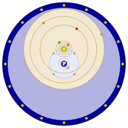 In this depiction of the Tychonic system, the objects on blue orbits (the moon and the sun) rotate around the earth. The objects on orange orbits (Mercury, Venus, Mars, Jupiter, and Saturn) rotate around the sun. Around all is sphere of fixed stars.