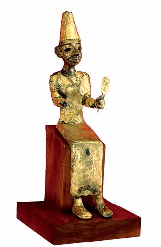 The chief of the pantheon and father of the gods worshipped by the Canaanites of Israel was El, who is portrayed here in gold-covered bronze. Excavated at Megiddo, Israel, it dates to 1400-1200 B.C.