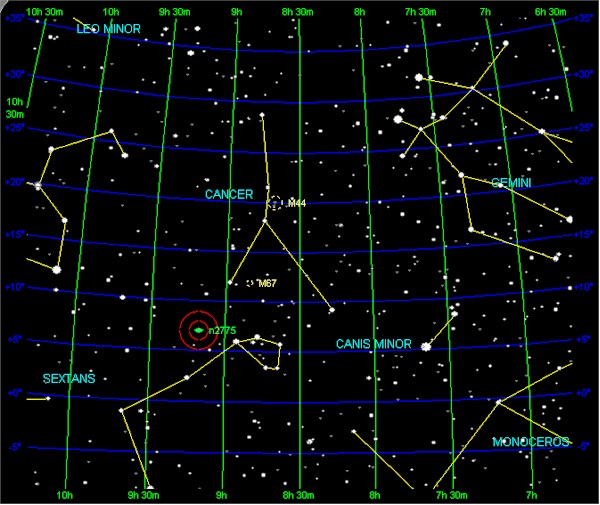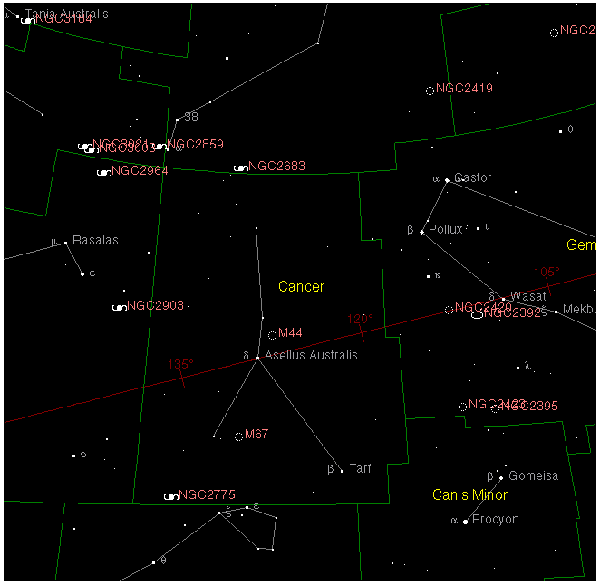 Cancer is one of the twelve constellations of the zodiac. Its name is Latin for crab and it is commonly represented as such. Cancer is relatively small among the constellations with an area of only 505 square degrees and its stars are rather faint. It lies between Gemini to the west and Leo to the east, Lynx to the north and Canis Minor and Hydra to the south. Cancer is the dimmest of the zodiacal constellations, having only two stars above the fourth magnitude.