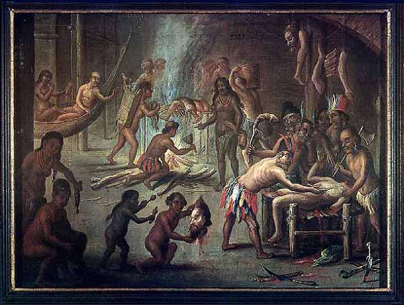 European explorers and colonizers brought home many stories of cannibalism practiced by the native peoples they encountered. The friar Diego de Landa reported about Yucatan instances, Yucatan before and after the Conquest, translated from Relacion de las cosas de Yucatan, 1566 (New York: Dover Publications, 1978: 4), and there have been similar reports by Purchas from Popayan, Colombia, and from the Marquesas Islands of Polynesia, where human flesh was called long-pig (Alanna King, ed., Robert Louis Stevenson in the South Seas, London: Luzac Paragon House, 1987: 45-50). It is recorded about the natives of the captaincy of Sergipe in Brazil, "They eat human flesh when they can get it, and if a woman miscarries devour the abortive immediately. If she goes her time out, she herself cuts the navel-string with a shell, which she boils along with the secondine, and eats them both.'"