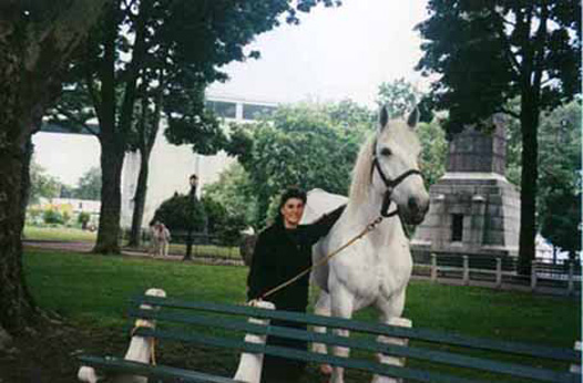 Saturday May 26, 2001 -- Today, as I looked out over the park I saw a white horse tied to a bench, its image becoming clearer through the mist of clouds that lifted as I watched.