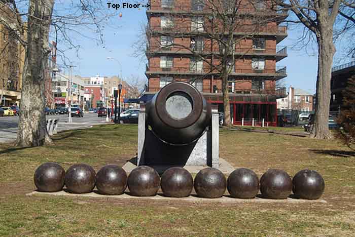 Several hundred years ago the soldiers from Fort Hamilton shot the cannon at the British navy and at Fort Wadsworth on the Staten Island side of the bridge. Every year, at the start of Fleet Week in NYC, this naval vessel sails under the bridge and fires at both forts.