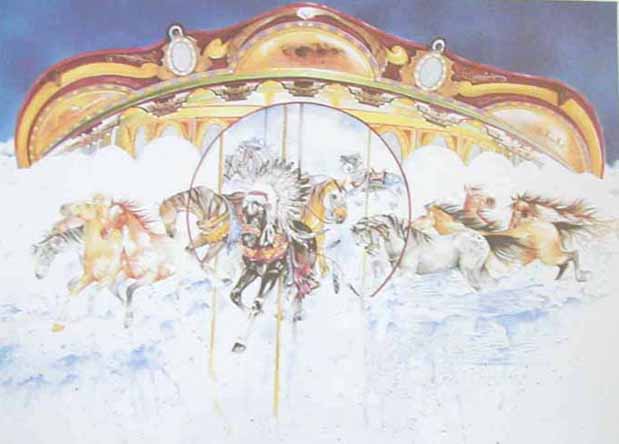 The carousel, the horse, behold a pale horse, revelation, movement to the next level of consciousness, the white bird who flies with the soul as protector from the Trickster, the wooden rocking horse who goes nowhere just moves back and forth, the music, the music box, harmonics, creation by tones, the bell that signals the ride has begun and has ended are all part of the movements of time.