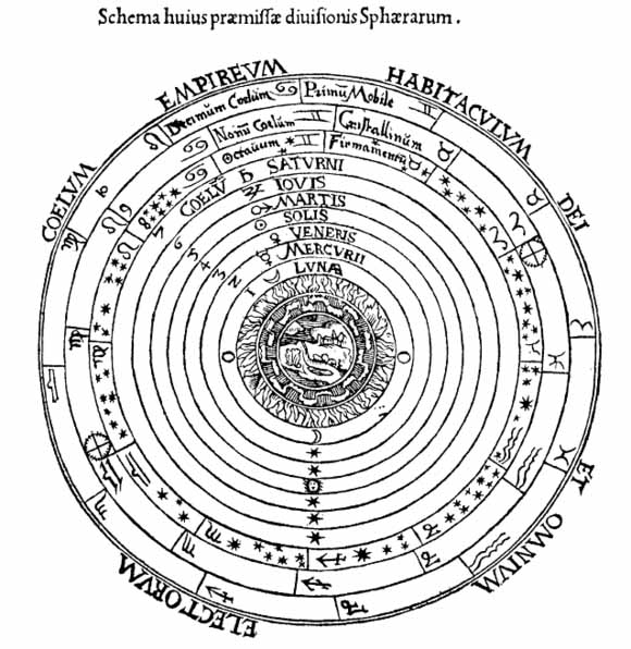 The celestial spheres, or celestial orbs, were the fundamental celestial entities of the cosmological celestial mechanics first invented by Eudoxus, adopted by Aristotle and developed by Ptolemy, Copernicus and others. In this celestial model the stars and planets are carried around by being embedded in rotating spheres made of an aetherial transparent fifth element (quintessence), like jewels set in orbs.