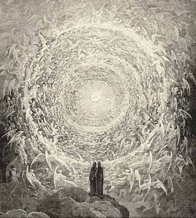 Some late medieval figures inverted the model of the celestial spheres to place God at the center and the Earth at the periphery. Near the beginning of the fourteenth century Dante, in the Paradiso of his Divine Comedy, described God as a light at the center of the cosmos. Here the poet ascends beyond physical existence to the Empyrean Heaven, where he comes face to face with God himself and is granted understanding of both divine and human nature.