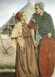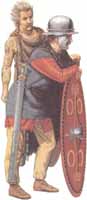 The Celts were a warlike, passionate people with a love of art. Truly, Celtic art is distinguished for its extensive curves and intricate knot work which is used to form complex decorations for weapons, jewelry and body tattooing. Along with the extensive use of body tattooing the Celts highlighted their naturally fair hair by washing it in lime-water. This fondness for art and personal decoration was merged with acts of barbarism, such as beheading their enemies and carrying the severed heads around the necks of their horses. The head was the ultimate source of spiritual power; to posses the enemies head, was to posses his spirit. Riding naked on fast moving, light chariots, shreiking and swinging large hacking swords and throwing spears was a most effective method of warfare for instilling terror into their enemies.