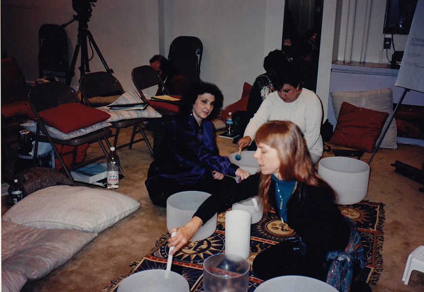 As each person lay on the floor - one bowl was placed on their solar plexus - then another to their right side - and one to their left. The bowls had to be in balance for that person's frequency. Chelsea played the bowls and chanted. Everyone joined in the harmonics.