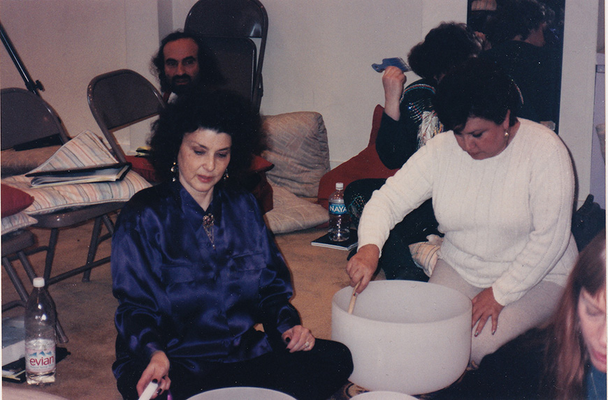I sat on the floor with my friend Yolanda and someone I met that afternoon, Ariel a talented pianist and singer from Long Island. Ariel and I moved the felt covered sticks over the bowls and began to chant. This set up a harmonic that brought others back into the classroom who felt connected.