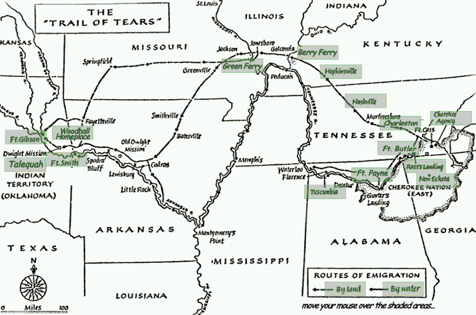 1830 - Cherokees were displaced from their ancestral lands in North Georgia and the Carolinas primarily as a result of the Gold Rush around Dahlonega, Georgia in the 1830's. Cherokee evict encroachers in Beaver Dam on Cedar Creek, a few miles south of present-day Rome, Georgia. Passage of the Indian Removal Act.