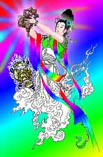 Then Nuwa melted rocks of five colours and used them to mend the cracks in the sky. She supported the four corners of the sky with the legs she had cut off from a giant turtle. She killed the black dragon to save the people of Jizhou, and blocked the flood with the ashes of reeds.