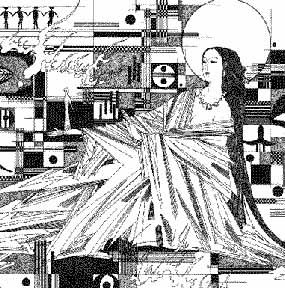North of the capital was the Green River, where the River Earl's three beautiful daughters rose from the drake-neck's green waves to play in the Bear's Heart Pool. Their jade ornaments tinkled, their flowerlike beauty was modest -- they might have been fairies of the Han River banks, or goddesses of the Lo River islets. The King, out hunting, espied them, was fascinated and lost his heart, not from lust for girls, but from eager desire for an heir. The three sisters saw him coming and plunged into the water to flee, so the King prepared a palace to hide in till they came back: