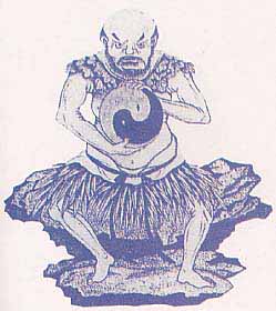 Another version ... In the beginning was a huge egg containing chaos and a mixture of yin-yang (female-male, cold-heat, dark-light, wet-dry, etc). Also within this yin-yang was Phan Ku who broke forth from the egg as a giant who separated the yin-yang into many opposites, including earth and sky. With a great chisel and a huge hammer, Phan Ku carved out the mountains, rivers, valleys, and oceans. He also made the sun, moon, and stars. When he died, after 18,000 years, it is said that the fleas in his hair became human beings. In summation, the Chinese say that everything that is - is Phan Ku and everything that Phan Ku is yin-yang.