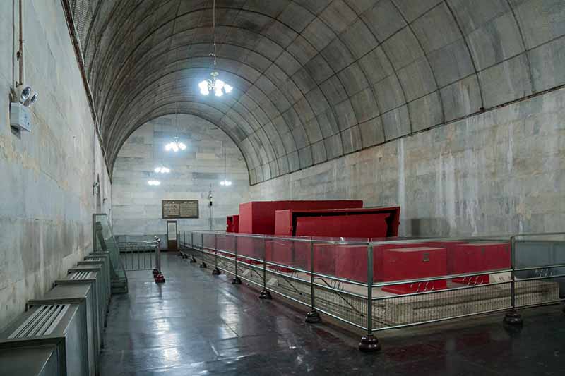The underground palace at Dingling Tomb consists of an antechamber, a central chamber and a rear chamber plus the left and right annexes. One of the pictures shows the central chamber where the sacrificial utensils are on display. Two marble doors are made of single slabs and carved with life-size human figures, flowers and birds. More than 3,000 articles have been unearthed from the tumulus, the most precious being the golden crowns of the emperor and his queen.