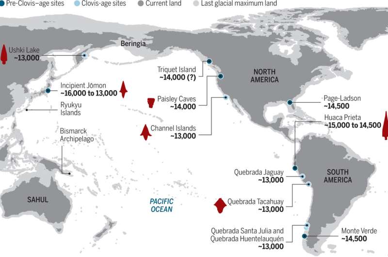 A team of anthropologists from several institutions in the U.S. has offered a Perspective piece in the journal Science outlining current theories regarding the first humans to populate the Americas. In their paper, they scrap the conventional view that Clovis people making their way across a Bering land bridge were the first to arrive in the Americas - more recent evidence suggests others arrived far earlier, likely using boats to travel just offshore.