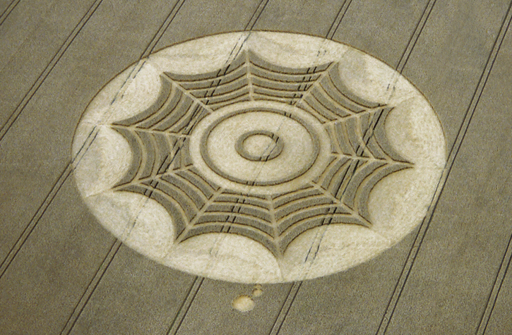 The shimmering effect is created by the crop being laid in opposing directions. Notice the ten points indicating two intersecting pentagrams. This web is quite appropriate as Avebury is a Goddess center, and Arachne can be found spinning her web in many places around Avebury.
