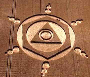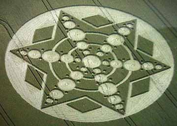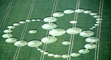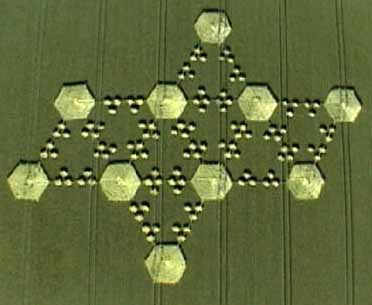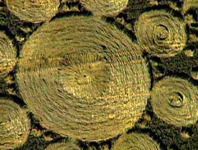 The 90-foot center circle has a bird's nest in the middle, which spirals out for a few feet, overlapping a radial lay, which in turn overlaps a clockwise lay that completes that circle. Each of the eight medium size circles has a different lay, ranging from the conventional, to S-swirl, to a sort of bizarre, spiral snake. These circles are each crowned with a small crescent, and (counting the ones inside the crescents) eight grapeshot adorn all of the eight "branches."