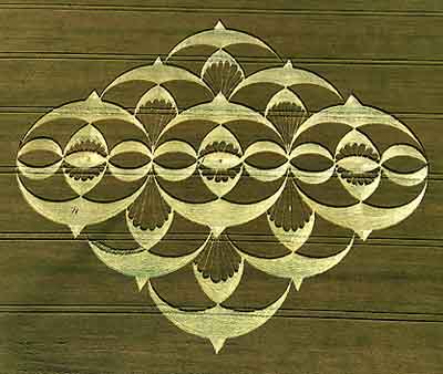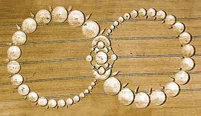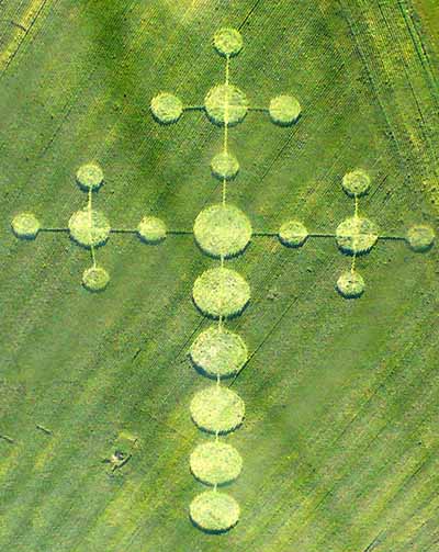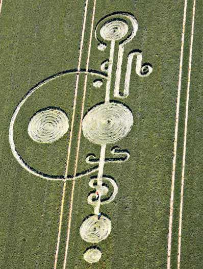 Other formations of note included: the huge circle at Avebury showed the solar system as it would appear on December 21st 2102, the Wavy Cross at West Woods, the extraordinary bubbles at Wayland's Smithy, the South Field Birds and the staggering number 8 which appeared on the eighth day of the eight month 2008 = 8/8/08 (see below).