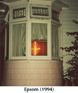 1997 - "A cross of light appearing in the window of a Devonport house has been hailed as another sign Christ has returned to the world." Thus begins a recent article, "Cross of light sign of Christ", in the New Zealand Sunday News. The article continues: "Sign writer Paul Larkin told Sunday News the cross of light he noticed in his bathroom window was a sign of "something big" about to happen. "It was spotted by Larkin three weeks ago, shortly after he moved into the house. He recognized it, having seen other crosses in Auckland and having learned about them at his Transmission Meditation group. "I'd been in the bath, hopped out and got changed. I came back and turned off the light and it was there." Larkin said the previous tenants in the house had not seen the cross. He said the cross "appeared when I was down quite a lot, sorting through a lot of problems. It has really helped me through it."
