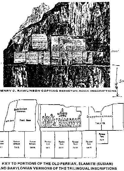 A British army officer, Sir Henry Rawlinson, had the inscription transcribed in two parts, in 1835 and 1843. Rawlinson was able to translate the Old Persian cuneiform text in 1838, and the Elamite and Babylonian texts were translated by Rawlinson and others after 1843. Babylonian was a later form of Akkadian: both are Semitic languages.