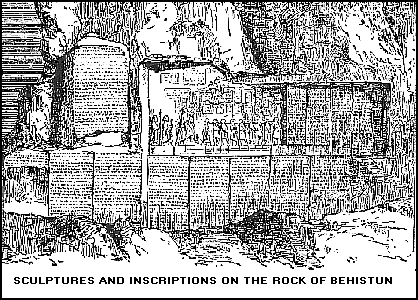 The first historical mention of the inscription is by the Greek Ctesias of Cnidus, who noted its existence some time around 400 BC, and mentions a well and a garden beneath the inscription dedicated by Queen Semiramis of Babylon to Zeus (the Greek analogue of Ahura Mazda). Tacitus also mentions it and includes a description of some of the long-lost ancillary monuments at the base of the cliff, including an altar to Hercules. What has been recovered of them, including a statue dedicated in 148 BC, is consistent with Tacitus' description. Diodorus also writes of "Bagistanon" and claims it was inscribed by Queen Semiramis.