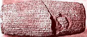 Cyrus the Great - 2,5OO years ago - Persian Empire. One of the important source for the history of Cyrus is the cuneiform writing on the Cylinder of Cyrus (above) discovered during excavations at Babylon which Cyrus entered in 539 B.C. In this written message to the Babylonians, dated 538-529 B.C., Cyrus declared: "I (am) Cyrus, thie king of the world, the king of Babylon, the king of Shumer and Akkad, the king of the four regions . . . When I entered Tintar (ancient name of Babylon) peacefully . . . I established my sovereignty in the palace of the princes, Marduk (the Babylonian national god) inclined the noble hearts of the people of Babylon towards me, for I was daily attentive to his worship . . ." Cyrus did in fact scrupulously respect the Babylonian religions and repaired the temples . In 539 B.C. he authorized the return to Palestine of the jews deported by Nebuchadrezzar and arrange for the rebuiidir'g of the Hebrew temple in Jerusalem.