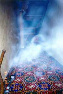Ectoplasmic residue is often spotted in pictures, when a ghost interferes with a shot. It can also be spotted in the air and sometimes with a special flashlight or pair of goggles. At times, moving through ectoplasm has been "noted" to be the cause of illness or possession. Breathing or exuding it is a sign of being in contact with the supernatural world. It is thought that ectoplasm is the reason that ghosts can materialize. The reason that this residue is visible is because it gives spirits a physical link to the corporeal world. Many cases of ectoplasmic residue often mark a strange appearance or physical disturbance in a haunted area. For this reason, when ectoplasm is spotted, specialists in spirit divination and ghost tracking are called.