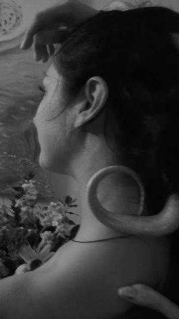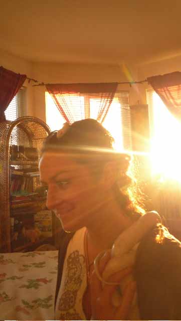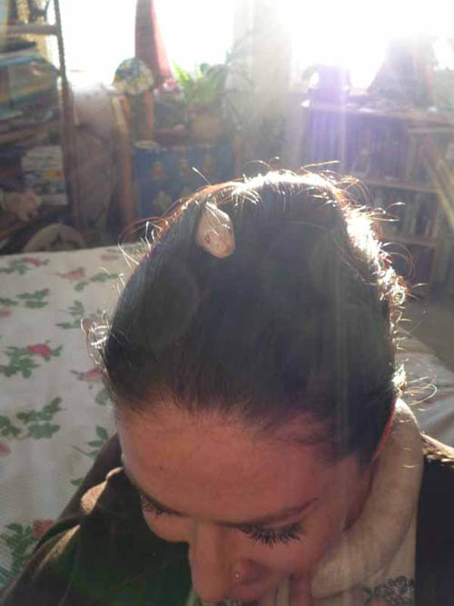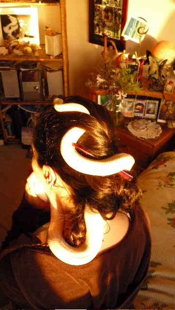 Soon his head went to the back of my long braid at the base of my head and started burrowing inside. He traveled up the braid like the caduceus with the rest of his body now coming around my neck and chest. At this point I called my friends and brothers who were close by to witness what was happening.