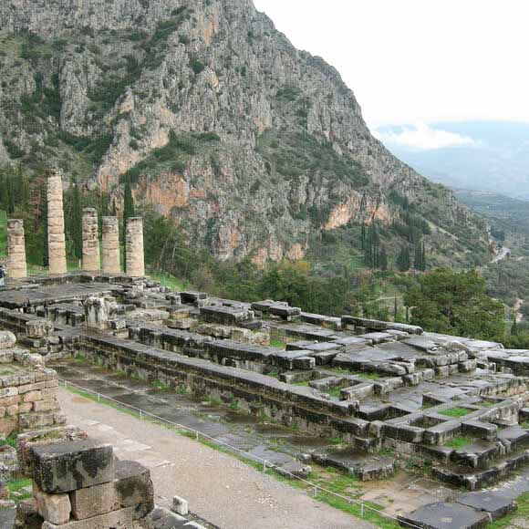 The centerpiece of Delphi was the temple of Apollo, built with donations from every Greek city-state and from abroad. The base of the temple still stands, with half a dozen of the original columns. On the outside of the base are over 700 inscriptions, most announcing the emancipation of slaves, which was considered a special act of piety to be performed at Delphi. At the far end of the temple is the altar, originally decorated with memorials, ex-votos, statues, and offerings.