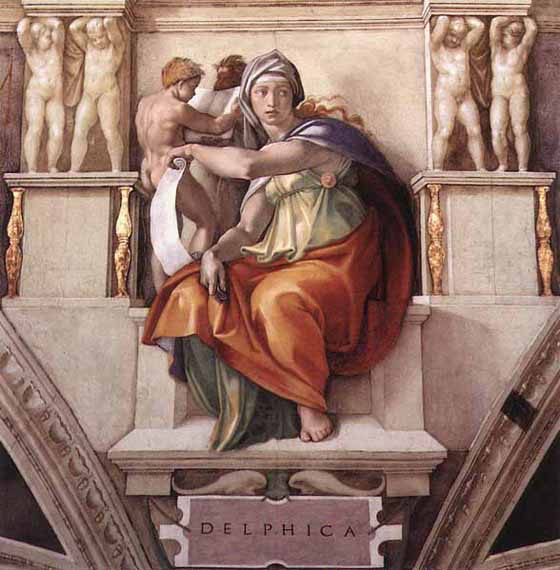 The Delphic Sibyl was the priestess presiding over the Apollonian Oracle at Delphi, a Greek colony, located in a plateau on the side of Mount Parnassus. She lived on Mount Parnassus and was believed by many to be a prophet. The word sibyl comes (via Latin) from the ancient Greek word (sibulla), meaning "prophetess". There were many Sibyls in the ancient world, but the Delphic Sibyl was among the most renowned because of the famous receivers of her advice, who were said to be Aegeus, Cadmus, Herakles, Oedipus, Orestes, Perseus and Xuthus.