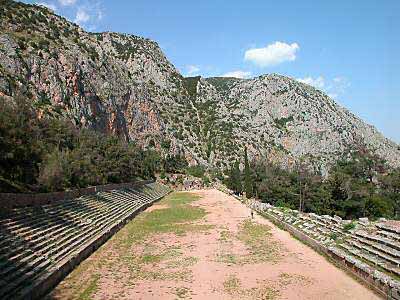 The Delphi stadium was located at the highest part of the city, partially cut into the rock. It originally sat down on the Delphian plain but was moved to this position in the 2nd and 3rd centuries A.D. The track was 600 Roman feet long and could hold 17 or 18 runners. Starting in 591 B.C., the athletic portions of the Pythian Games were held here every eight years, commemorating Apollo's slaying of the serpent Python. The stadium could seat about 6500 spectators.