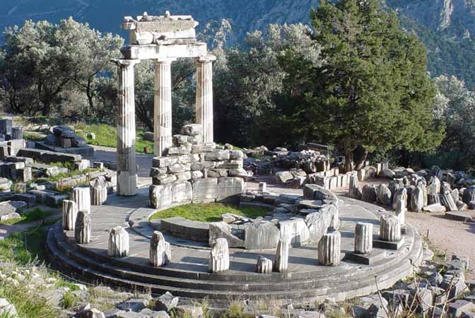 The Tholos at the sanctuary of Athena Pronaia is a circular building that was constructed between 380 and 360 B.C. It consisted of 20 Doric columns arranged with an exterior diameter of 14.76 meters, with 10 Corinthian columns in the interior. The Tholos is located approximately a half-mile (800 m) from the main ruins at Delphi. Three of the Doric columns have been restored, making it the most popular site at Delphi for tourists to take photographs.