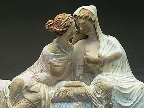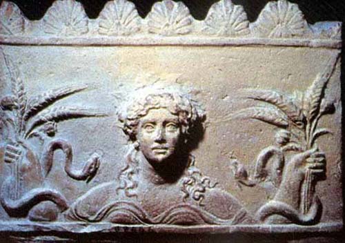 Demeter was usually portrayed on a chariot, and frequently associated with images of the harvest, including flowers, fruit, and grain. She was also sometimes pictured with Persephone.