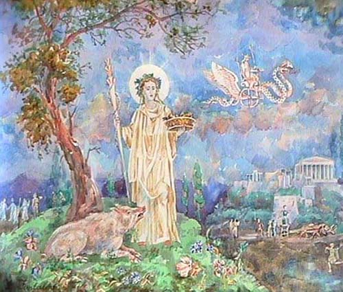 In Greek mythology Demeter ("mother-earth" or possibly "distribution-mother") is the goddess of grain and fertility, the pure nourisher of the youth and the green earth, the health-giving cycle of life and death, and preserver of marriage and the sacred law.