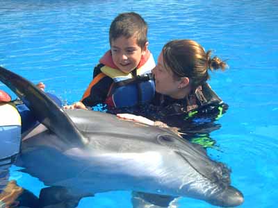 Dolphins often show a fondness for young children. Sometimes when a child enters a pool dolphins, they are immediately surrounded by attentive females. Working with dolphins has had positive results with autistic children and others with 'special needs'. The research continues. Dolphin assisted therapy's agenda focusing on children with autism, Down syndrome, and Cerebral Palsy with rehabilitation in motor function, speech, and language, and attention span.