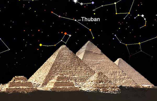 The Pyramids on the Giza Plateau were designed to have one side facing north, with an entrance passage geometrically aligned so that Thuban would be visible at night. At the time the Great Pyramid was built (set in place), one of the shafts aimed toward the star that was then closest to the north celestial pole. The other aimed at the Belt of Orion one of the brightest and most impressive constellations.