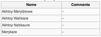 Known rulers, in the History of Egypt, for Dynasty X are as follows (dates are uncertain):