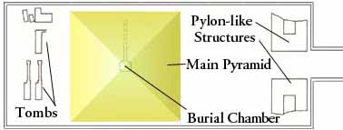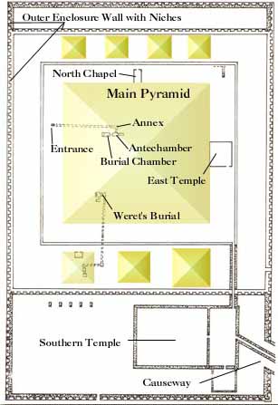 The causeway, which was broad with a steep slope and enters the enclosure wall on the middle of the east side, has not been investigated at all, and we are told that the valley temple has not even been found. The core of the pyramid was built much like that of Senusret I's pyramid , with a core that had corners radiating out. A framework was made with horizontal lines of blocks to form a grid, or framework between the corners. Here, however, the filling was sand. The entire complex was surrounded by an enclosure wall that was much more rectangular then that found in older pyramids. It was oriented east-west.
