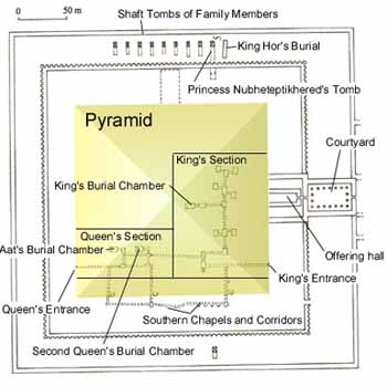 A small pyramid lies at the north end of this row of mastabas, thought to be that of a queen. If it is not the pyramid of a queen, but an unlikely cult pyramid, it would have been the last such structure built, rather then that of his grandfather's, Senusret I. Though this pyramid does have a North Chapel, Petrie never found a subterranean structure even after exhaustive investigation.